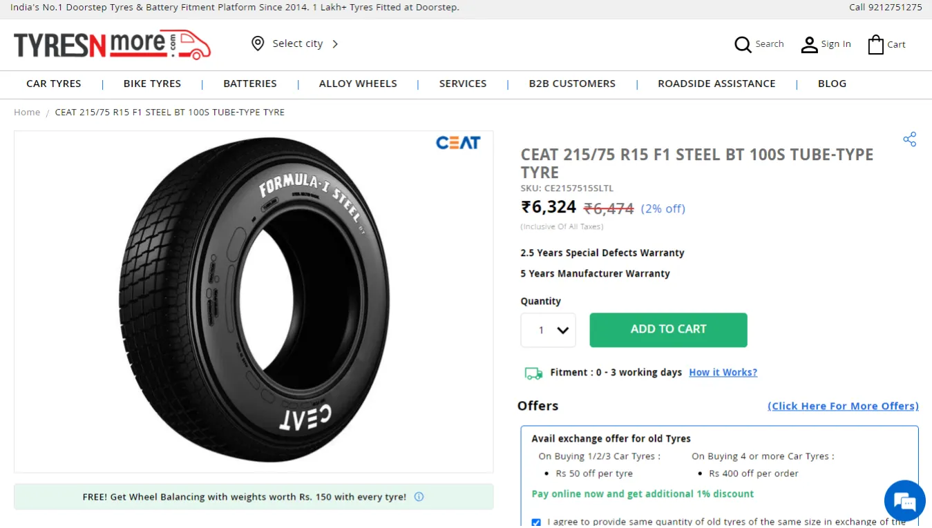 Tyresnmore is premier eCommerce site in India that provides tyres and batteries. Backed by CEAT, Tyresnmore caters to the customer across 12 cities in India. Along with 1000+ tyres, 60+ batteries for 900+ car models & 140+ two-wheeler models, they also provide assured warranty, along with doorstep tyre fitment and battery replacement service.